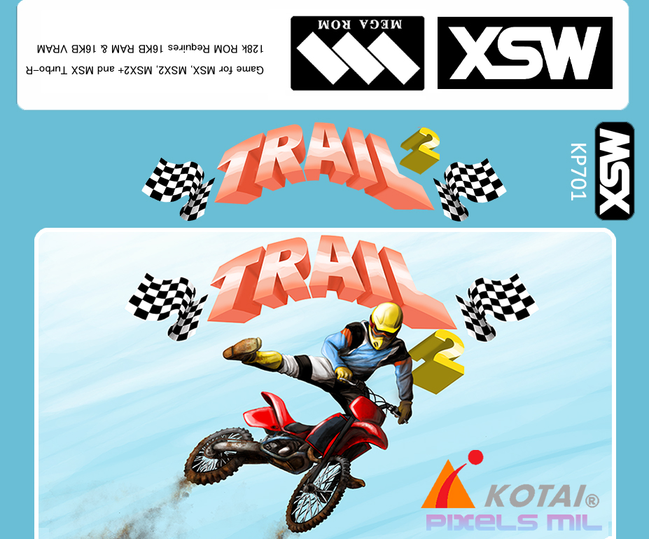 Trail2 es un juego de motos en el que puedes jugar a dobles o contra la máquina y consta de 5 fases. En el momento que pierdes 3 carreras o te quedas sin gasolina acaba el juego. Ganas si consigues más victorias que tu oponente y hay un final especial para quien gane las cinco carreras, cosa que yo no he conseguido nunca jugando contra la CPU y eso que soy el programador del juego.