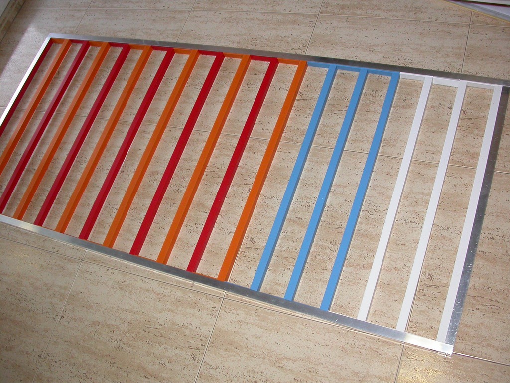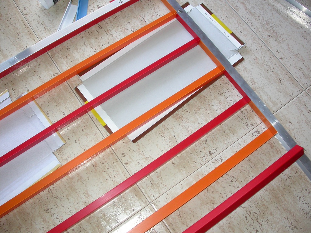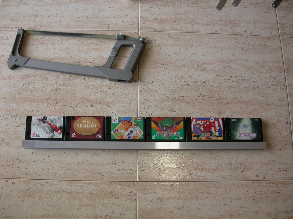 El poner 6 cartuchos a lo ancho no es por capricho, he buscado un número que fuese múltiplo de los 66 cartuchos de Konami y los 18 de Taito por lo que si pongo 6 cartuchos por fila tendré 11 filas para los juegos de Konami y 3 filas para los de Taito. Para los juegos de otras compañías he dejado 3 filas más que son hasta 18 cartuchos. Y aquí es donde entra en juego los colores tan raros que he elegido para los ángulos de PVC. Como los juegos de Konami, Taito y otras marcas no estarán en una misma fila he decidido hacer las filas con el color del logotipo de la compañía. Para las 11 filas de Konami he pensado ir alternando entre el rojo y el naranja: