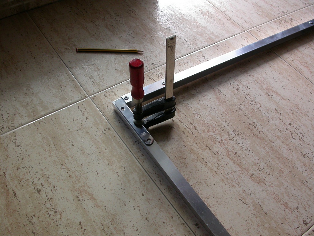 Para que no se fuese la máquina al perforar y poder centrar bien los agujero del marco con la escuadra lo que he hecho es poner la escuadra por fuera y sujetarla con gatos dejando un poco de margen hasta la esquina porque cuando pongamos la escuadra por dentro tendrá un pared y no podrá ir a ras del canto. Así hago el agujero del marco en el sitio exacto donde la escuadra tiene los agujeros.