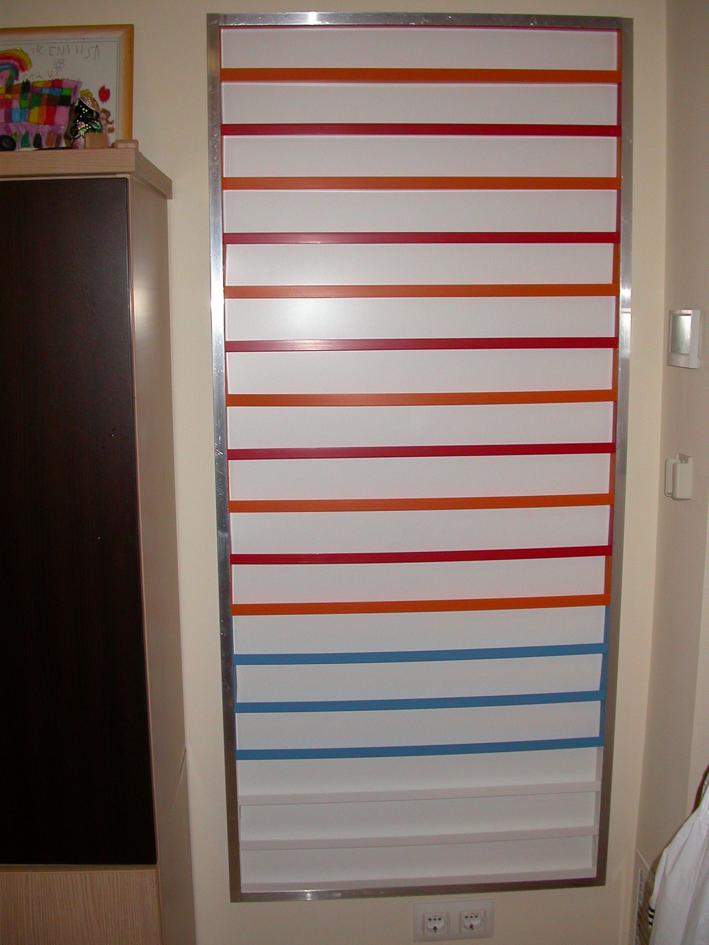 Una vez tenemos la fila donde va el cartucho cortamos los laterales que taparán el agujero de la U de aluminio. La separación que hemos dejado entre fila y fila es de 7cm (la altura de un cartucho) más los 2 cm de cada fila, teniendo que hacer los laterales de 9 cm. Como tenemos 17 filas de 9 cm cada una más los marcos superior e inferior que tienen 2 cm cada uno la altura total de la vitrina es de 17*9+2*2 = 157 cm.